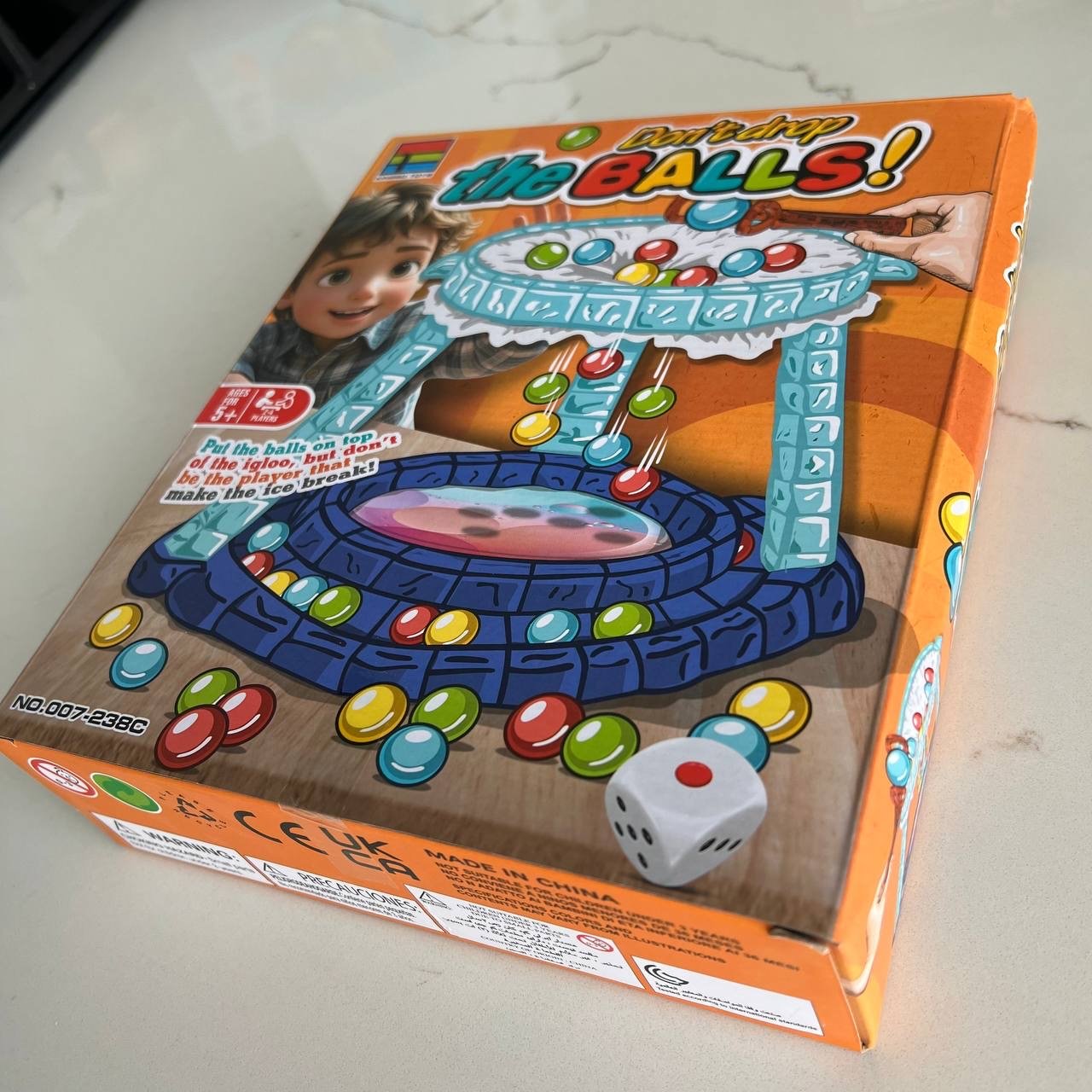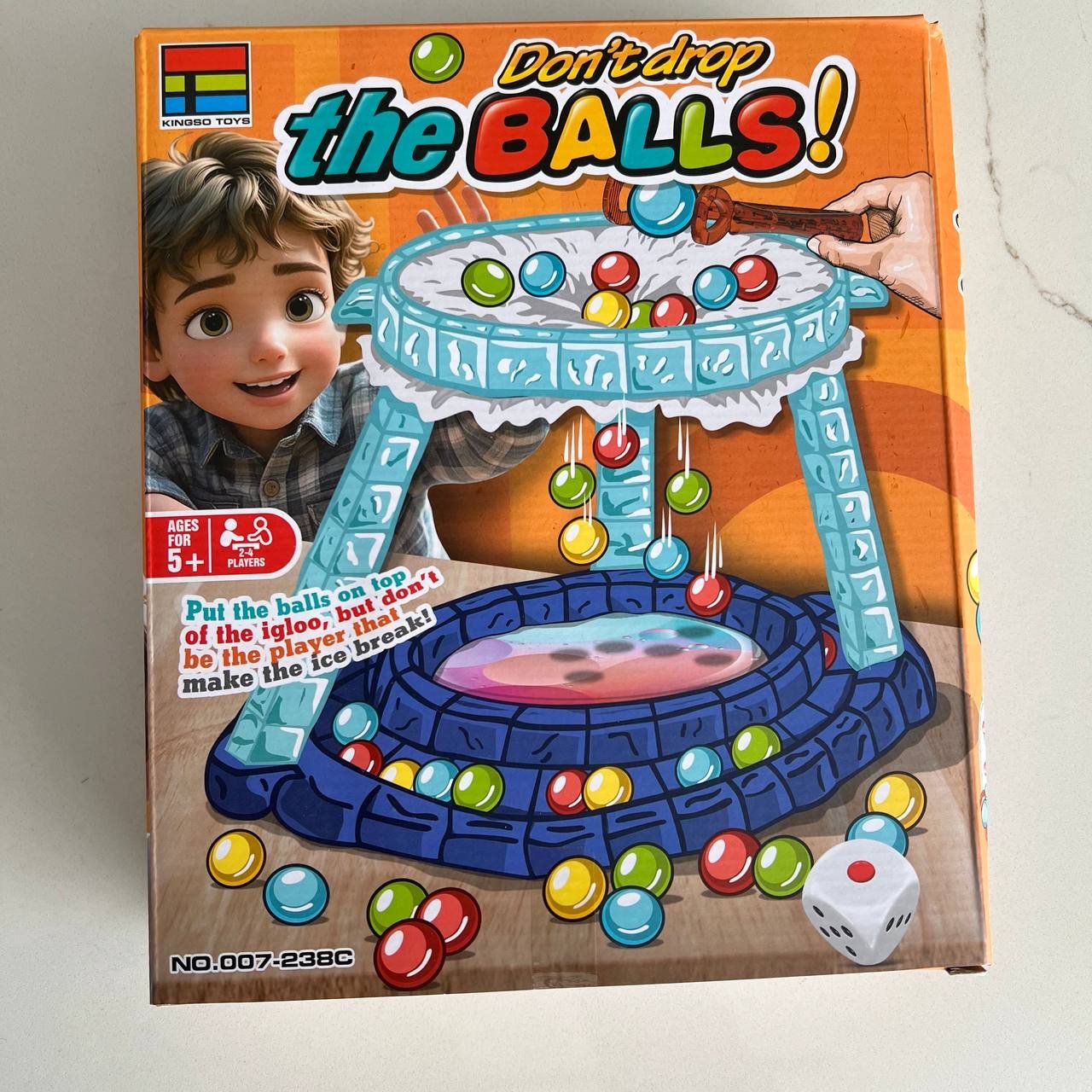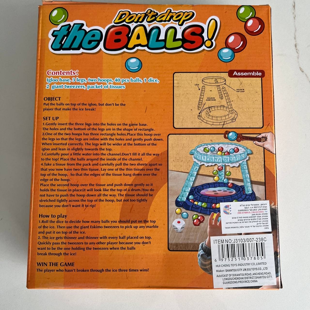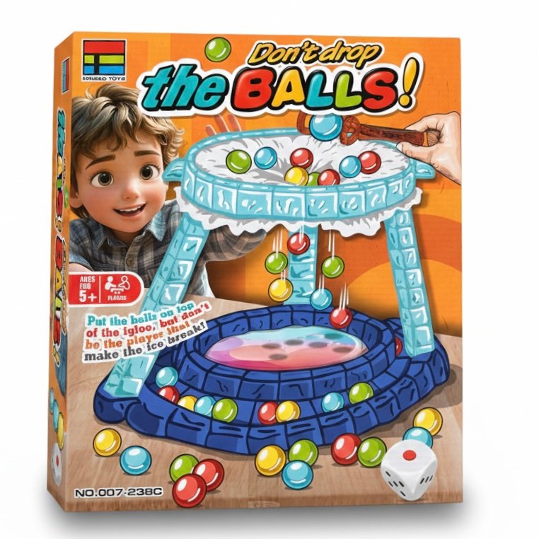 • قاعدة اللعبة، حلقات التثبيت، 40 كرة ملونة، نرد، ملقط عملاق، وحزمة مناديل.