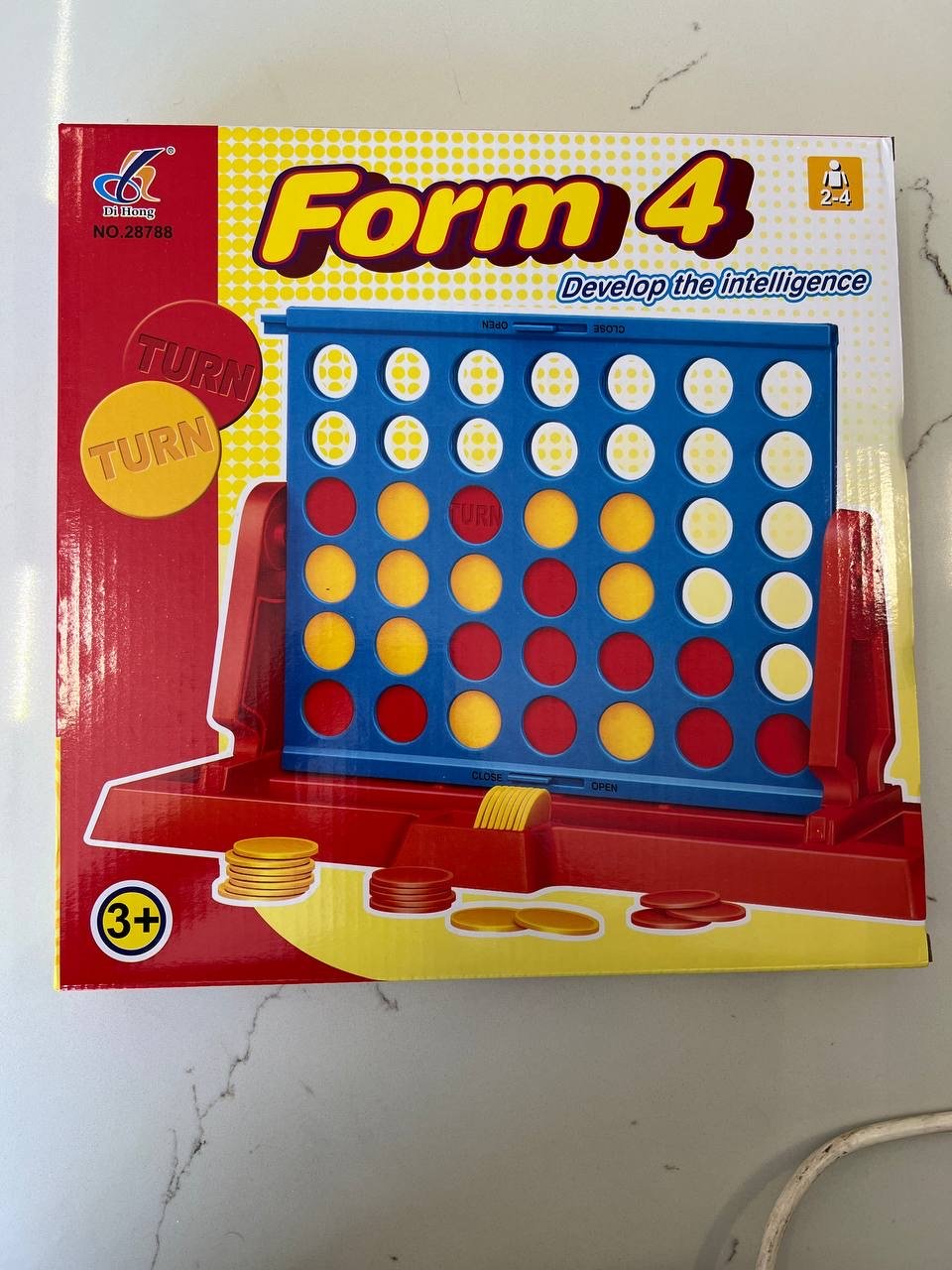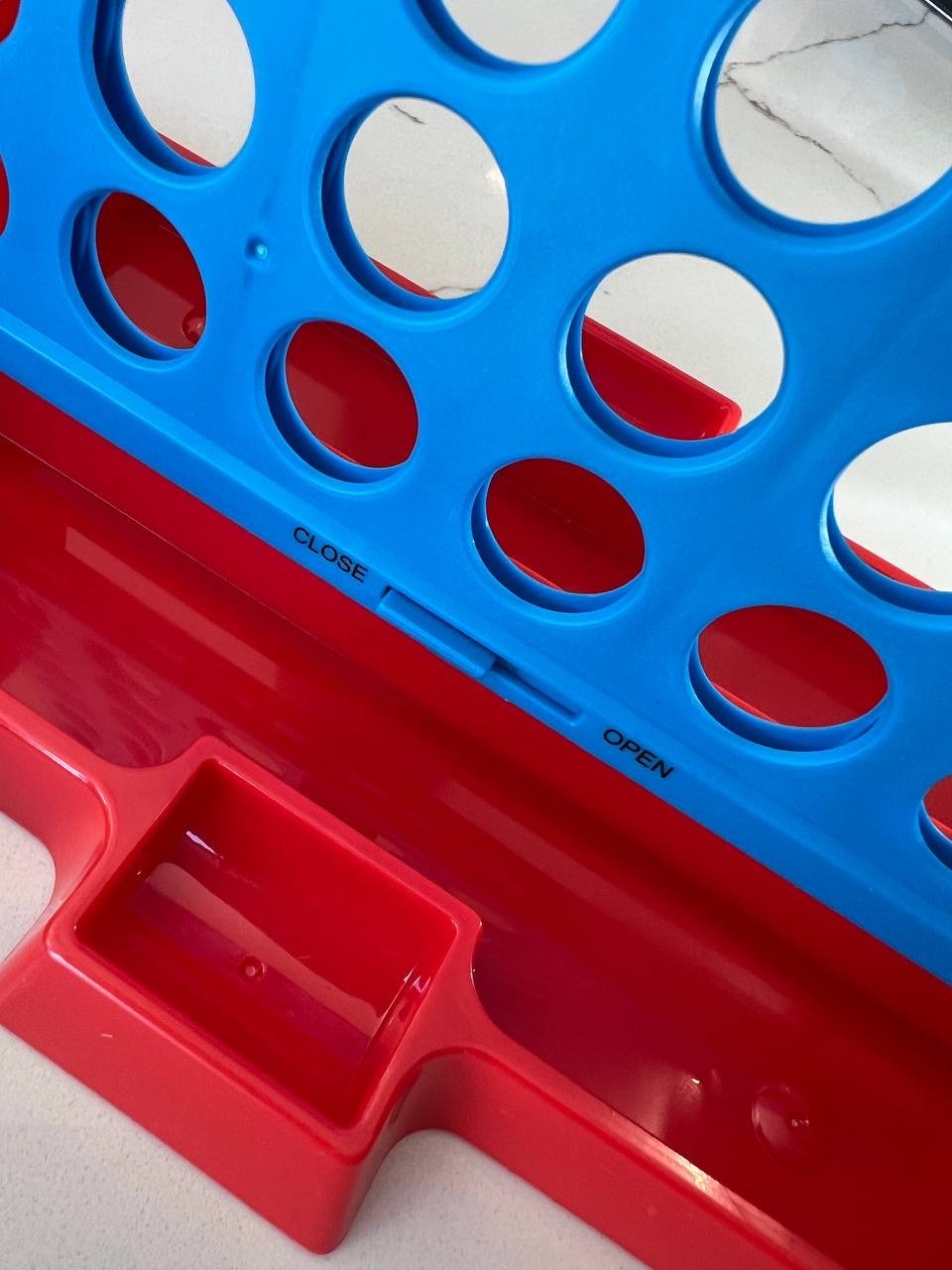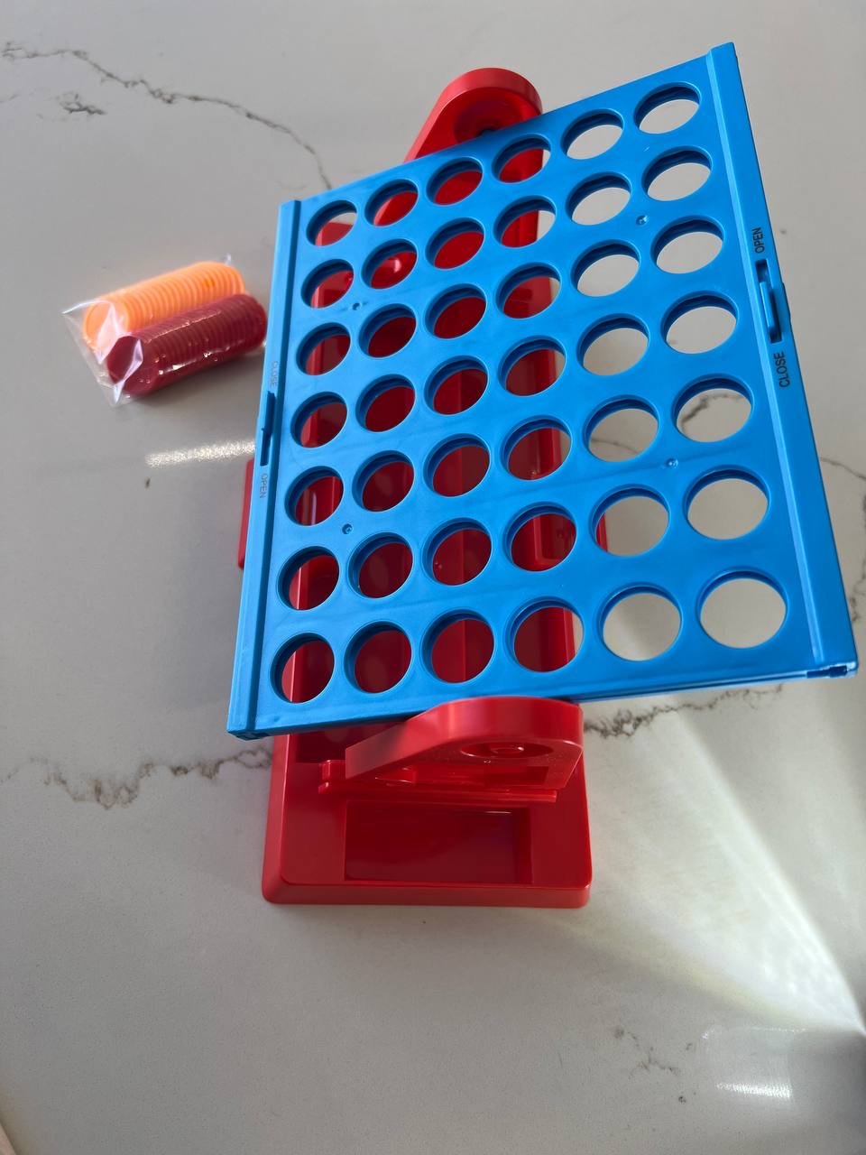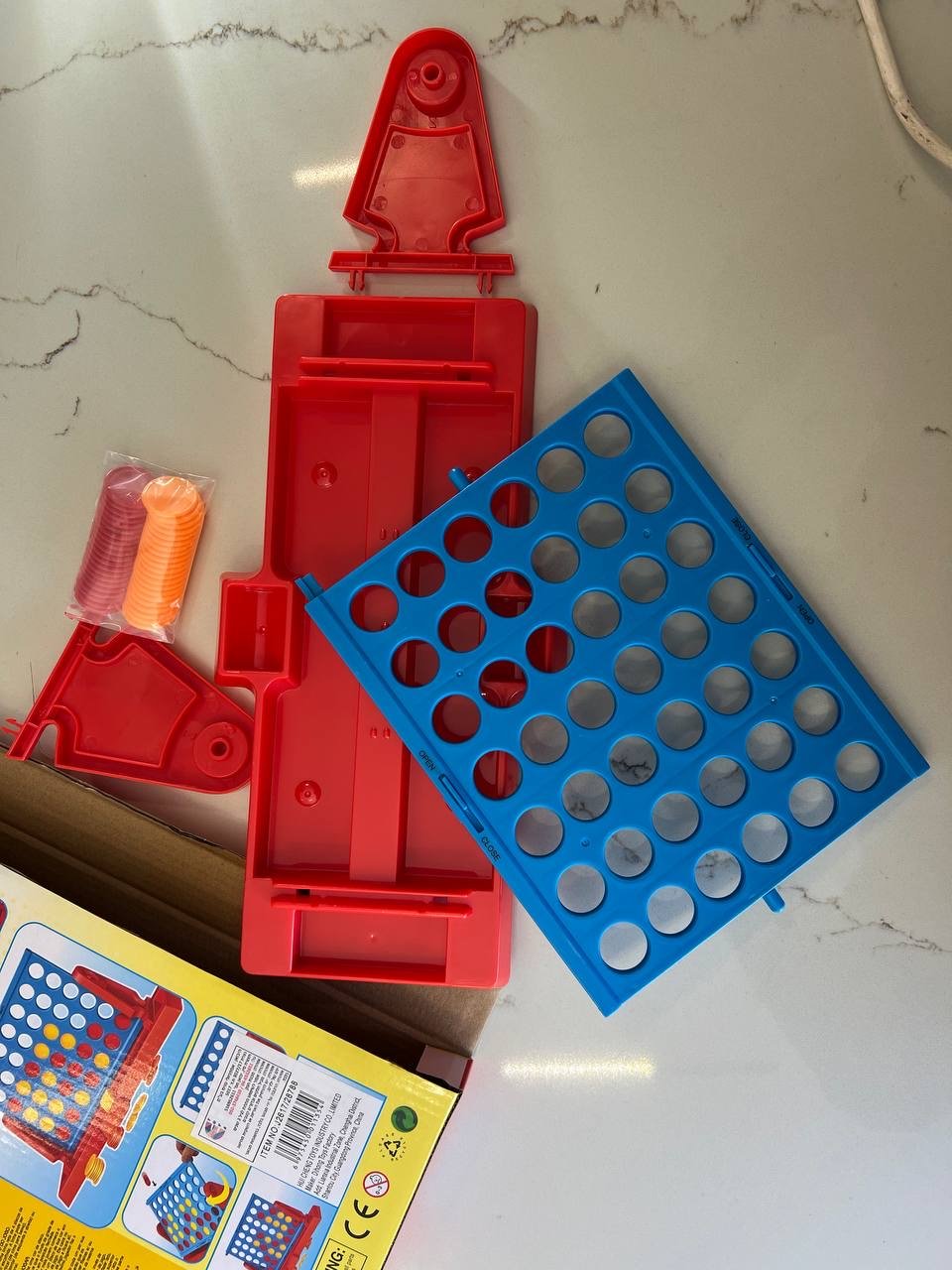 • المحتويات: شبكة اللعب، قطع ملونة (أصفر وأحمر)، وقاعدة لتجميع القطع مع قفل.